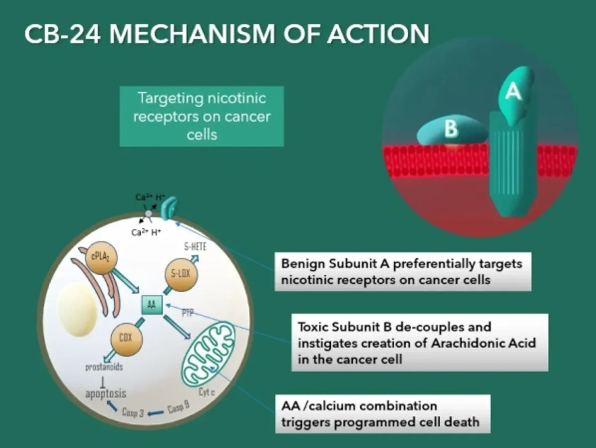 CB-24 is a nicotinic antagonist that can attach to several subtypes of nicotinic receptors. It is reported that alpha nicotinic receptors are highly expressed on a variety of malignant cell types (Pucci et al., Frontiers in Cellular Science. 2022), being enhanced due to remodelling of cellular membranes in malignant cells to include more negatively charged phospholipids such as phosphatidylserine (Szlasa et al., Bioenerg Biomembr. 2020). It has been well established that nicotine and nicotine-derived nitrosamines have been identified as the major and potent carcinogens. Upon binding of CB-24 to its receptor the PLA2 B subunit is released and attracted by the more negative membrane surface on the malignant cells, initiates its enzymatic action to digest the membrane releasing palmitate and arachidonic acid (Kattah et al., Toxicon 2002). The membrane is compromised and there is an influx of Ca2+ further activating L-type Ca2+ channels. Malignant cells have a significantly poorer membrane repair capacity compared to normal cells increasing their sensitivity to this form of attack (Frandsen et al., J Membrane Biol, 2016). Elevation of Ca2+ activates intracellular PLAs that further generate arachidonic acid triggering an intracellular cascade resulting in the synthesis of anti-apoptotic prostaglandins and lipoxygenase metabolism (Snider et al., PNAS, 1984) to produce LXA4 and its analogue 15-epi-LXA4 (Brigatte et al., Mediators Inflamm, 2016). Arachidonic acid causes apoptosis exclusively through the mitochondrial pathway which is preceded by permeability transitioning pore opening, cytochrome c release, and cleavage of caspase 9 and 3 LXA4 and its analogue 15-epi-LXA4 are potent immunomodulators that can also suppress tumour proliferation and modulate immune cells through formyl peptide receptors: a secondary and useful effect of CB-24.